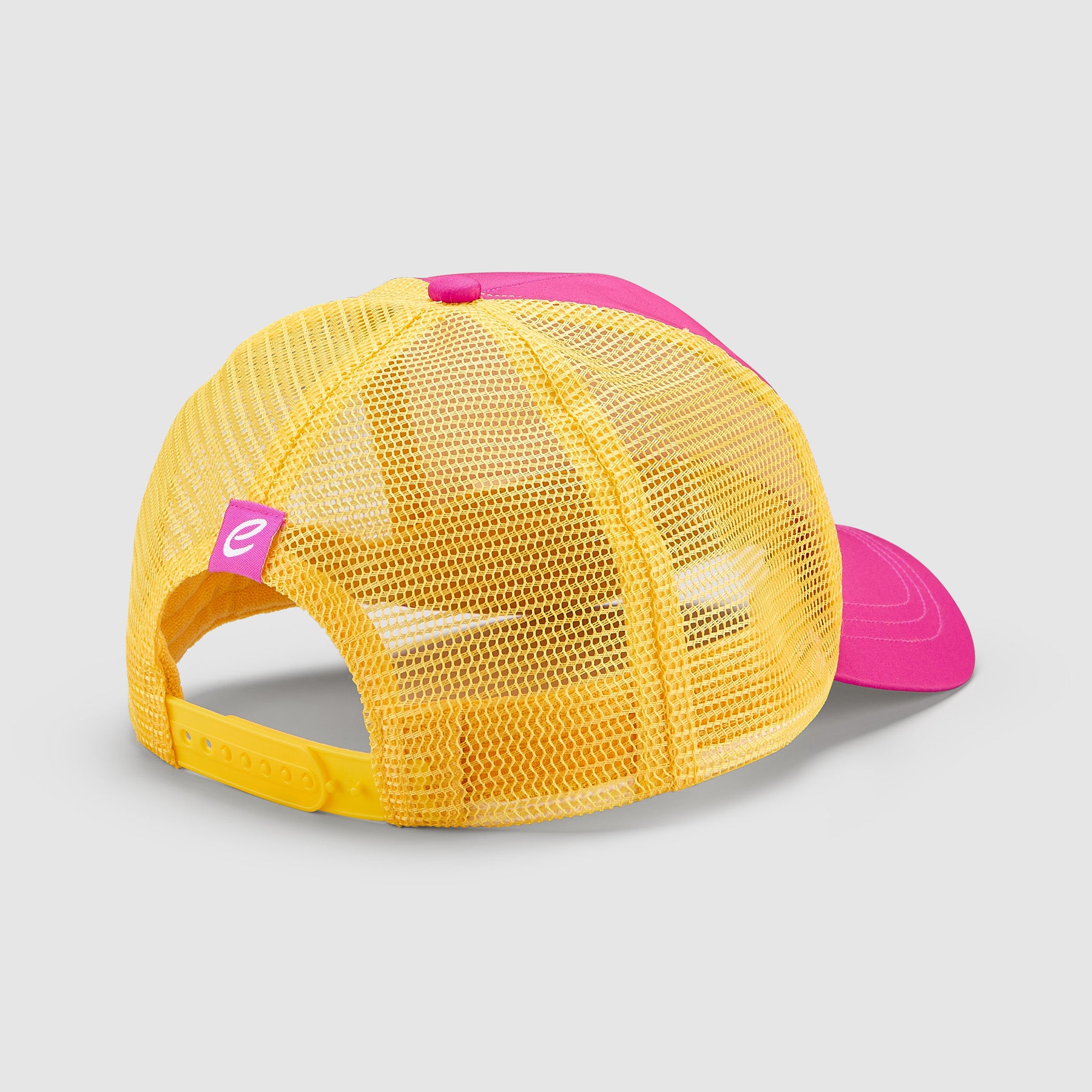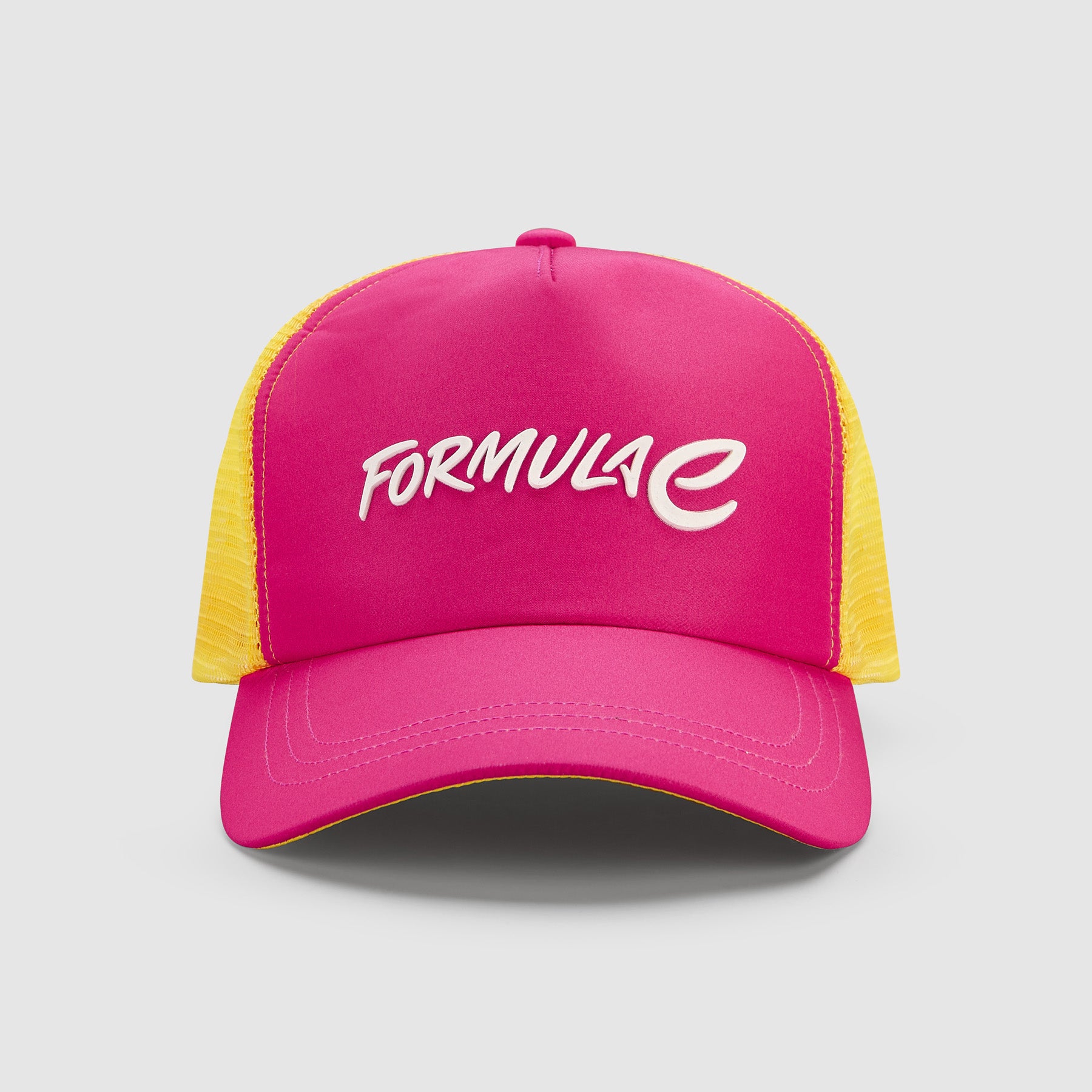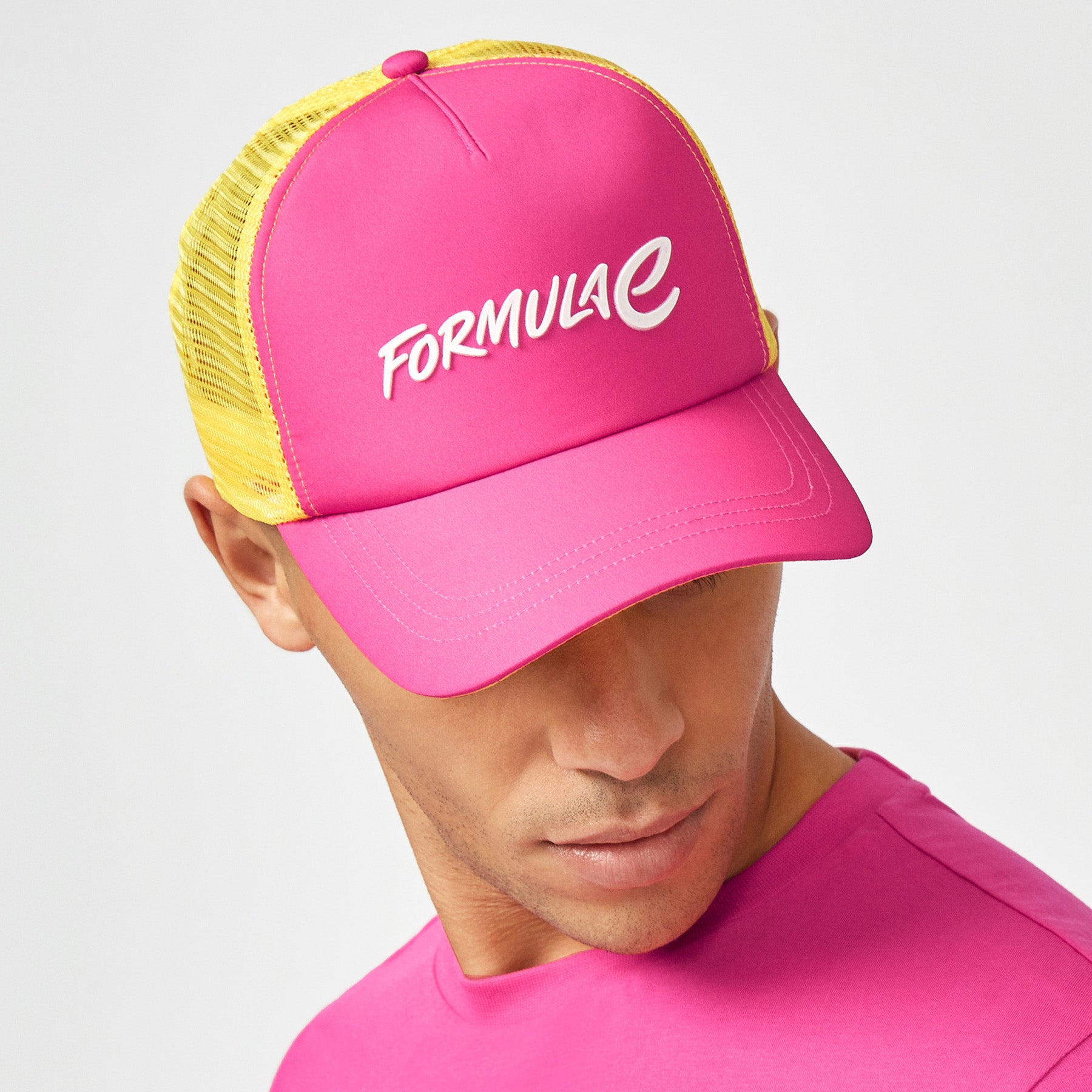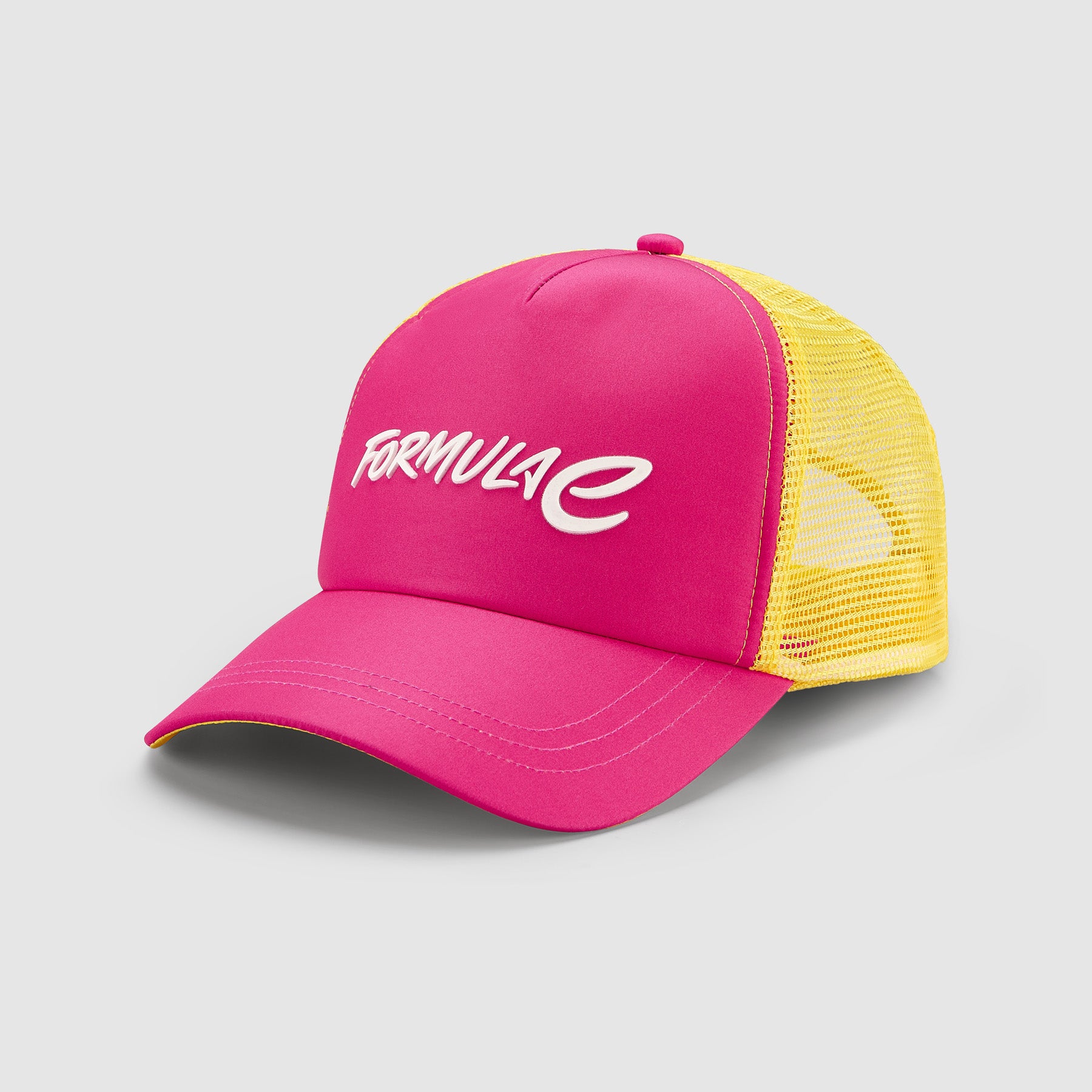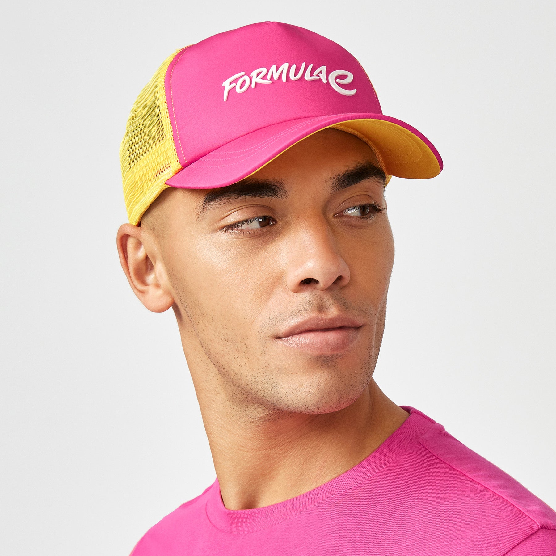 Show your support for electric racing with the Formula E Unisex Wordmark Pink Trucker Hat. Made from 100% recycled polyester, this stylish trucker cap features a breathable mesh back for comfort and the bold Formula E wordmark embroidered on the front. The folded “E” logo label at the rear adds a signature touch, while the contrasting color under-peak and adjustable snap-back fastening ensure a perfect fit for all-day wear.