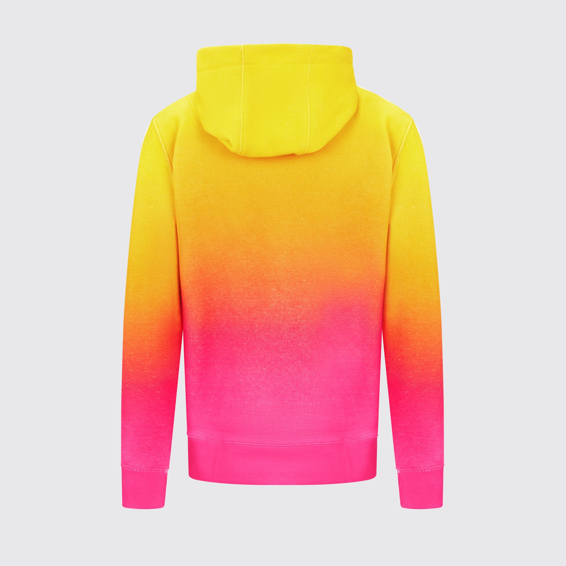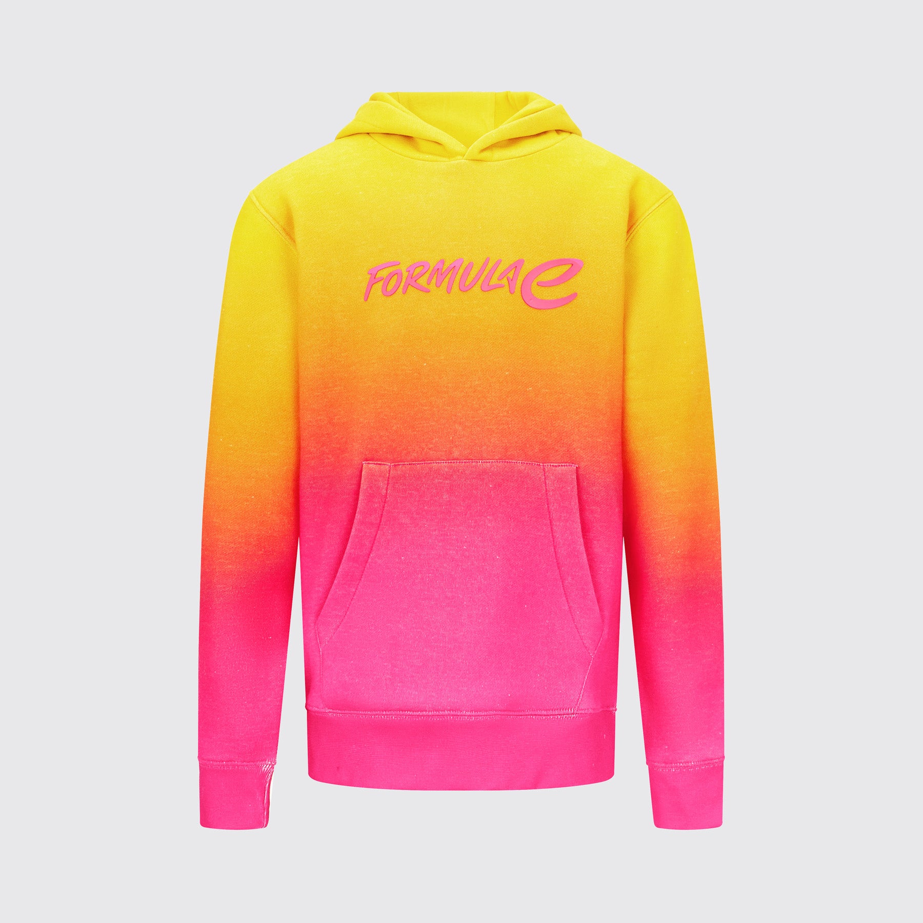 Add vibrant style to their day with the Formula E Kids Gradient Pink Yellow Hoodie. Made from a sustainable blend of 43% organic cotton, 39% recycled cotton, and 18% recycled polyester, this hoodie features a unique gradient dye effect blending pink and yellow hues. It showcases a large high-definition Formula E logo print on the chest, ribbed cuffs and hem for a snug fit, and a kangaroo pocket for everyday convenience.